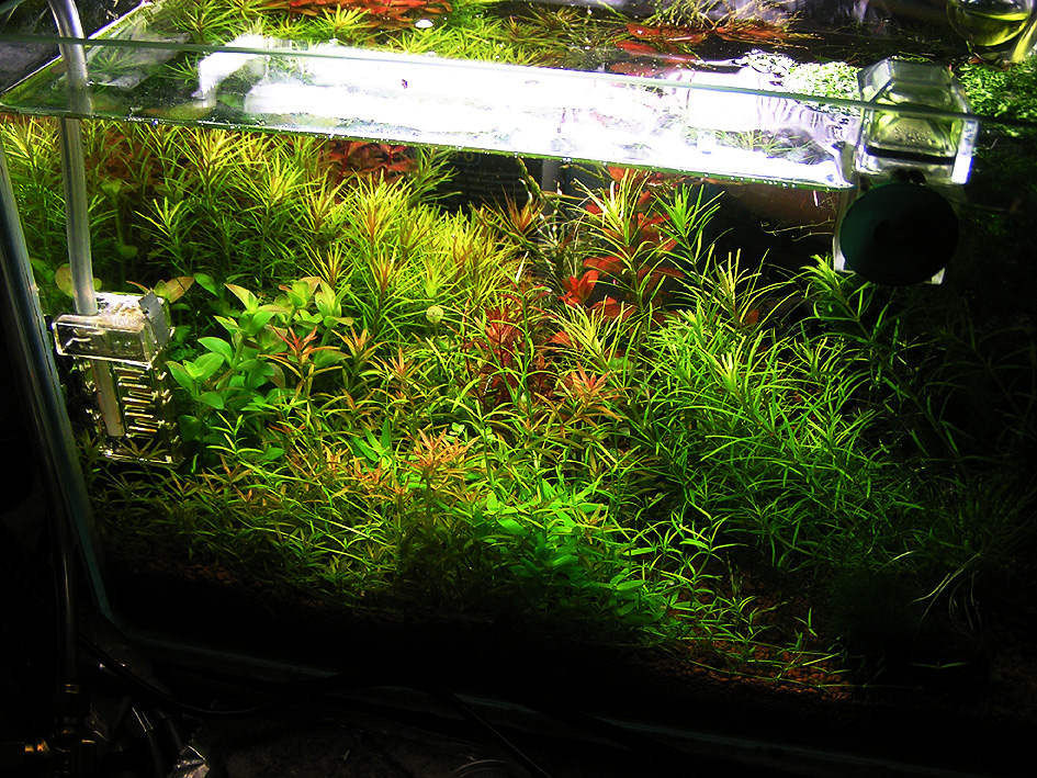 | Altwasser Nano Größe: 12L Licht: 24Watt (1x11W +1x 13W G23) [965 Vollspektrum + 6000k 3Banden) Co2 per Flipper Ada Africana soil PH 4,5 - 5,5 Kh0 Düngung: TMG+ (später All-in-one) Besatz: kleine Gyraulus Tellerschnecken, Hüpferlinge, Grüne Hydras |